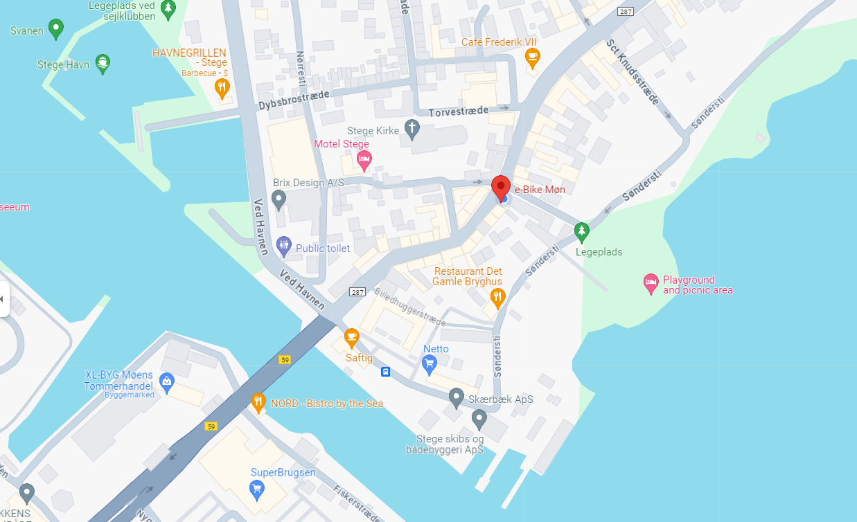 We got free parking (no hourly limits) 100 meters from the shop, here you’re welcome to leave the car, and explore Møn on the e-bike.